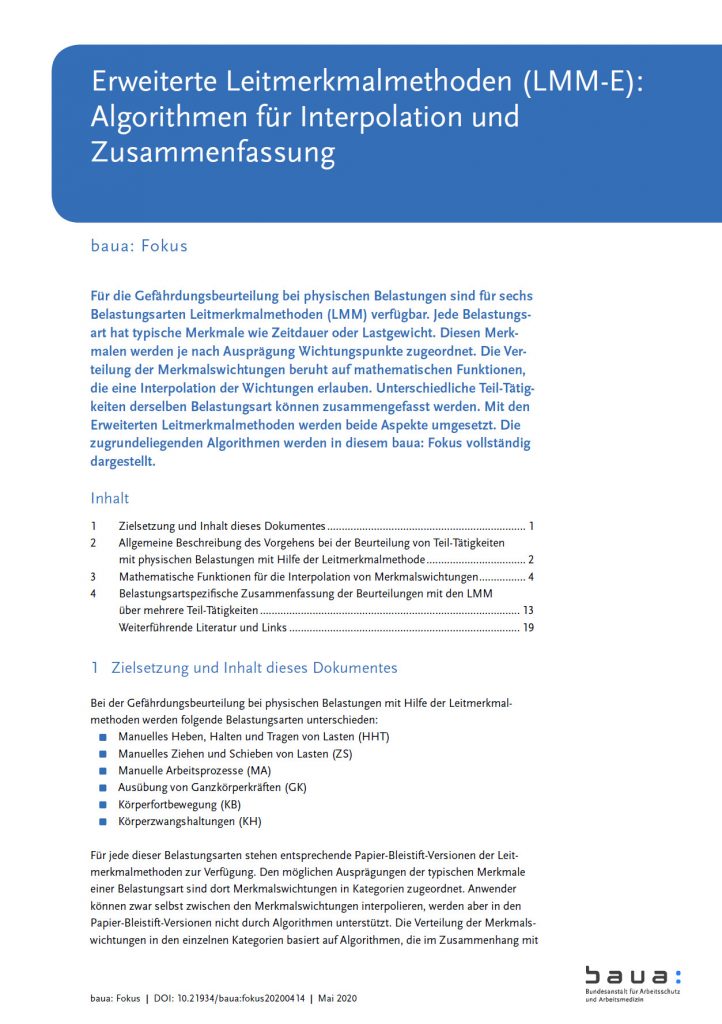 Auch die „Erweiterten Leitmerkmalmethoden (LMM-E)“ sind von der BAuA herausgegeben worden. Interaktive PDF-Instrumente dazu sollen von der BAuA zu einem späteren Zeitpunkt zur Verfügung gestellt werden.