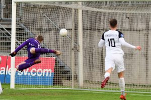 Da gab es für Gäste-Torhüter Stefan Zabel nichts zu halten. Beyhan Ametov (nicht im Bild) erzielte das 2:0 für de WSV – © Jochen ClassenDie Partie gegen Wegberg-Beeck wurde vorgezogen, weil sich der eigentliche Gegner Fortuna Düsseldorf U23 wegen eines positiven Coronafalles in Quarantäne befindet. Die Tore für den WSV erzielten Saric ( 23./78.), Ametov (45.) und Gencal (89.).