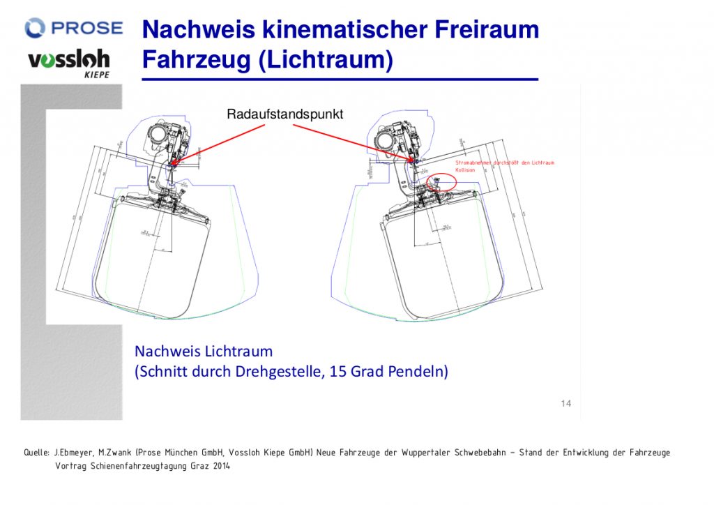 Auf den Fotografien ist deutlich zu erkennen, dass die Räder bei Schräglage der Bahn auf der Kante der Schiene laufen. Hierdurch wird die Schienenkante in das Radprofil eingepresst und ein Wulst in der Mitte des Radprofils aufgeworfen. Das sind bleibende Verformungen, die einhergehen mit Rissbildung, Versprödung und Abplatzungen. Das alles ist hochgefährlich. Bei dem Betrieb der Bahn unter diesen Bedingungen können die Spurkränze jederzeit abreißen und die Bahn entgleisen. Die Ursache hierfür ist konstruktiv bedingt. Am verwendeten Material – heute Stahl der Sorte Excelsior N, früher Excellent – liegt es nicht. Es handelt sich bei diesen Materialien um unlegierte Vergütungsstähle von etwa gleicher Art. Die konstruktiven Fehler aber hätte man vor der Inbetriebnahme verhindern können. Zum einen ist es im Maschinenbau üblich, neue Systeme auf Prüfständen zu testen, die die Belastungen unter realen Bedingungen simulieren. Die WSW aber haben das Gerüst, die neuen Wagen und auch die Kunden als Testumgebung genutzt und damit schwer beschädigt. Schon die Konstruktionszeichnungen des Herstellers zeigen zum anderen bereits im Jahr 2014, dass es im Betrieb zu der Kollision zwischen Rad und Schiene und zwischen Bahn und Gerüst kommt.
