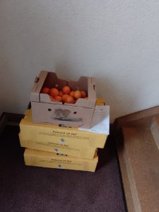 Der Paketdienst DHL hat am 25.01.2025 elf Kisten „echte“ Orangen von gebana geliefert. Vier weitere Kisten sind für spätere Termine vorbestellt. Die Kisten fassen mit 13 kg zwar ein verhältnismäßig großes Gewicht, sind aber „orangenfreundlicher“ als die10kg-Kisten von „Orangen süß statt bitter“: Sie sind statt ca. 25 cm nur ca. 15 m hoch (siehe Foto).
