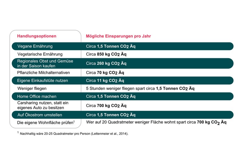 Neben Gastronominnen und Gastronomen sind weitere Akteurinnen und Akteure gefragt, die zu einer gelingenden Transformation des Ernährungssystems beitragen. Der Zukunftsimpuls gibt daher ebenfalls Empfehlungen an die Politik, (Land-)Wirtschaft und Wissenschaft sowie Tipps zu nachhaltigen Lebensstilen und was jede und jeder Einzelne dafür tun kann. Die Autorinnen ordnen dafür unter anderem die Wirkung von Klimatipps ein, wie etwa Fleisch versus vegane Ernährung. Denn häufig ist nicht klar, was wirklich viel CO2-Ersparnis bringt: eine eigene Einkaufstüte nutzen, regionales Obst und Gemüse kaufen oder sich vegan ernähren? Die Tabelle unten zeigt beispielsweise, dass eine vegane Ernährung rund 1,5 Tonnen CO2-Äquivalent einspart und schon die Umstellung auf pflanzliche Milchalternativen rund 70 Kilogramm CO2-Äquivalente ausmachen.