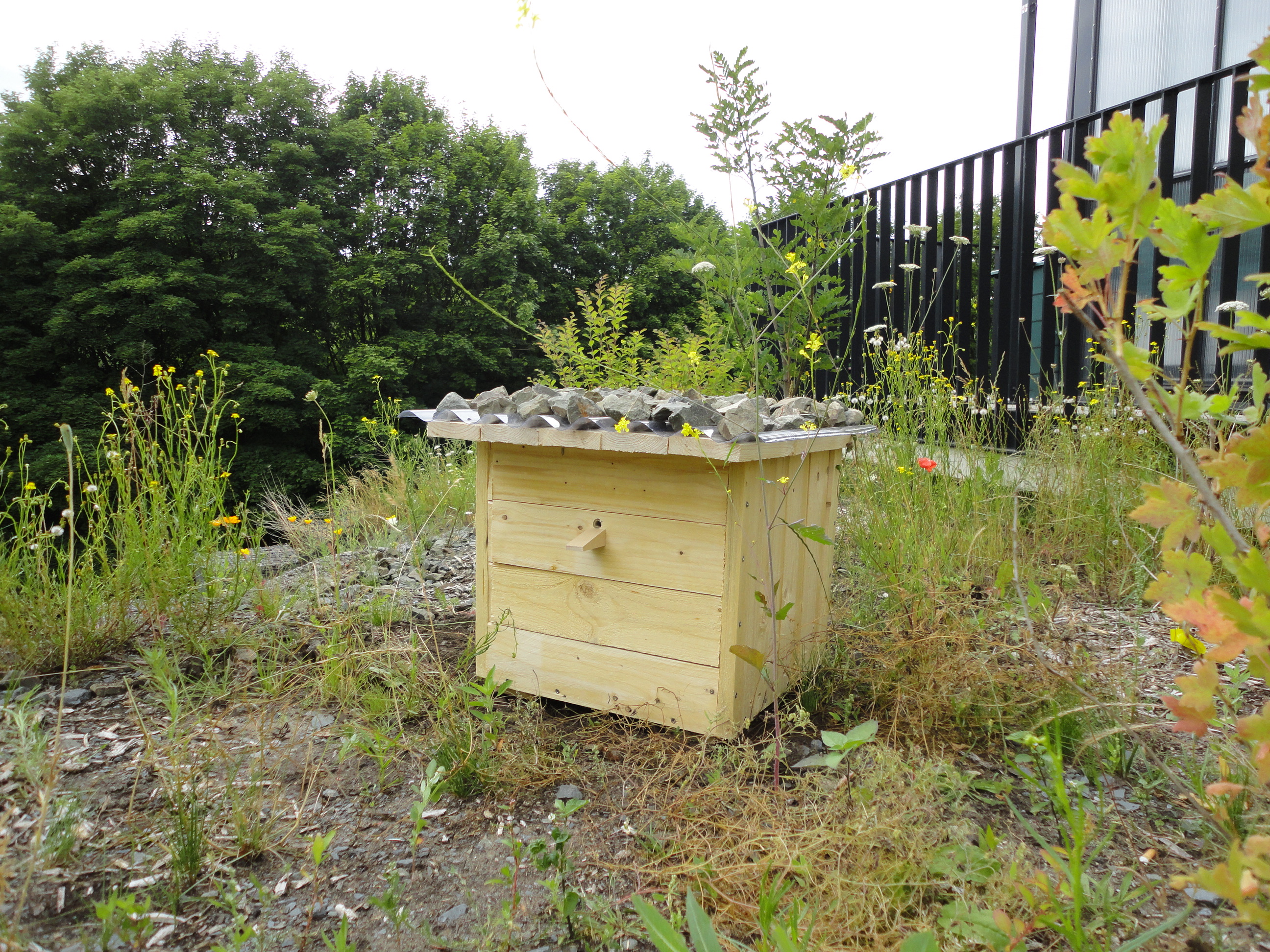 Dieser Hummelkasten steht hinter dem neuen Gewächshaus bei Gebäude W.
