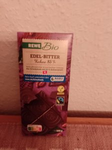Und wie sieht es bei REWE um die Ecke, hier in der Elberfelder Südstadt, in der Blankstraße, aus? Kein Fairbruary-Plakat und keine gesonderten Fairtrade Angebote. Es gibt allerdings ein reiches Angebot an der Eigenmarke REWE BIO, und ein Teil davon ist auch von Fairtrade zertifiziert. Dazu gehört die Schokolade „EDEL-BITTER Kakao 85%“.