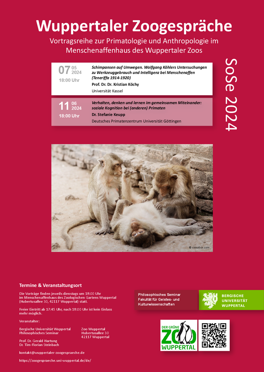 Die Vortragsreihe „Wuppertaler Zoogespräche“ bildet eine Kooperationsveranstaltung des Wuppertaler Zoos und des Philosophischen Seminars der Bergischen Universität Wuppertal. Wissenschaftlerinnen und Wissenschaftler berichten aus den Bereichen der Primatenforschung, der philosophischen sowie evolutionären Anthropologie, der Geistes- und Ideengeschichte allgemein verständlich aus ihren Forschungsprojekten und stellen diese zur Diskussion.