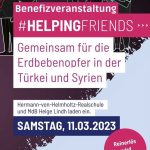 MdB Helge Lindh und die Hermann-von-Helmholtz-Realschule laden herzlich zur großen Benefizveranstaltung „HELPINGFRIENDS – Hilfe für die Erdbebenopfer in der Türkei und Syrien“ am 11.03.2023 ein.