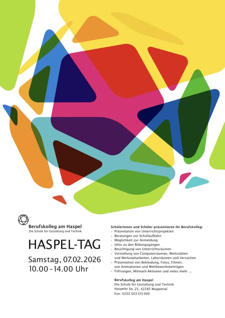 Am Samstag nach den Halbjahreszeugnissen (07.02.2026) präsentiert sich das Berufskolleg am Haspel (Haspeler Str. 25) beim sogenannten Haspel-Tag der Öffentlichkeit. Zwischen 10 Uhr und 14 Uhr erhalten interessierte Schüler:innen und deren Eltern in der Schule viele Infos über die verschiedenen Bildungsgänge. Hier werden die einzelnen Schwerpunkte inklusive vieler toller Projekte und Schülerarbeiten präsentiert, die verschiedenen Fächer stellen sich vor und alle haben die Möglichkeit Fragen zu stellen oder sich mit den Lehrerinnen und Lehrern auszutauschen. Darüber hinaus ist es an diesem Tag auch möglich sich über die eigene Schullaufbahn beraten zu lassen und sich sofort für einen der Bildungsgänge anzumelden.