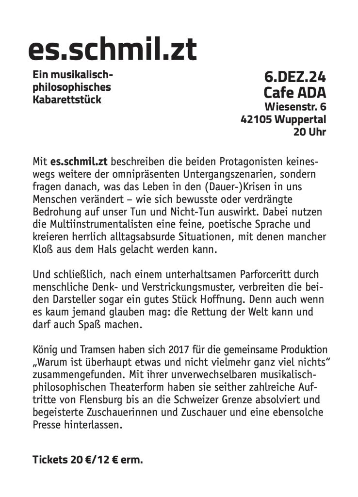 22.11.2024JumpingfishProductions es.schmil.zt Hans König und Helge Tramsen am 6.12. im Café Ada Karten an der Abendkasse oder auf WUPPERTAL-LIVE . Ähnliche Beiträge:Festkonzert zum Tag der Deutschen Einheit: Noch Karten zu habenEine junge Frau und ihr Weg in die Freiheit. Der neue Roman von Marica Bodrožič»Das Mädchen vom Moorhof« von Selma LagerlöfParty für Alle: Achim Petry in der Börse»Sohn ohne Vater« (KiWi 2025) - ein Roadtrip quer durch EuropaThomas Mann - ein Leseabend Weiter mit: Adventskonzert St. Remigius Deutsche Lebenslügen. Der Antisemitismus, wieder und immer noch Aktuell auf Polizist bei Motorrad-Kontrolle verletzt – Fahrer flüchtet, aber nicht... Gefahrenbremsung in Barmen – 73-Jähriger im Bus schwer verletzt: Polizei... Unfall mit Polizeifahrzeug in Heckinghausen Remscheid – 76-jährige Seniorin auf Treppe überfallen – Polizei... der Rubrik Kultur