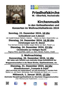 Festliche Musik an den Weihnachtstagen gehören wie Tannenbaum und Stollen zum „Fest“. Auch im Elberfelder Ölbergdom wird die Tradition der besinnlichen wie strahlenden Kirchenmusik fortgesetzt. Dazu lädt Kantor Thorsten Pech wieder herzlich ein, beginnend am 24.12. in der Christvesper um 16.30 Uhr mit stimmungsvollen Gesängen für Sopran, Tenor und Orgel, u.a. von Bach und Mozart. Es wirken Tina Hermann, Sopran und Arian Stettler, Tenor mit. Eine besondere Atmosphäre bietet in der Heiligen Nacht die Christmette um 23 Uhr. Durch die, nur mit Kerzenlicht ausgeleuchtete, Friedhofskirche erheben sich die schwebenden Klänge der Querflöte, gespielt von Magnus Mihm und begleitet an der Wilhelm-Sauer-Orgel von Thorsten Pech.