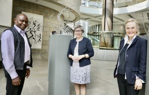 Bei der Ausstellungs-Eröffnung im NRW-Landtag (v.l.n.r.) Amouzou Amouzou-Glikpa, Landtags-Vizepräsidentin Carina Gödecke (SPD), Beate Schroedl-Baurmeister – © Foto Detlef IlgnerDer Tanz gilt als nonverbale Form der Kommunikation, die Menschen verbinden kann – über Grenzen und kulturelle Unterschiede hinweg.