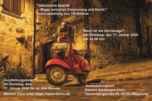 Am Samstag, 17. Januar 2026, eröffnete der Wuppertaler Fotograf Till Brühne seine Fotoausstellung „Italienische Abende – Magie zwischen Dämmerung und Nacht“ bei friseure bredtmann-klein in der Tannenbergstraße 63. Rund 25 Gäste folgten der Einladung und sorgten für eine lebendige Vernissage mit vielen Gesprächen, interessierten Nachfragen und ersten Bestellungen von Postkarten und Wandkalendern.