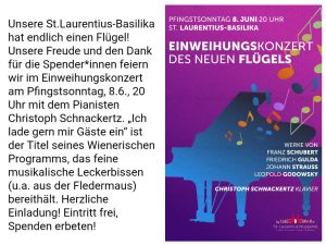 28.05.2025Susanne Eller Einweihungskonzert des neuen Flùgels Herzliche Einladung: Pfingstsonntag (08.06.25)20:00h/ Basilika St.Laurentius. Aktuelle Stellenangebote: »Alle Stellen bei KNIPEX Ähnliche Beiträge:Pfändungsfreibetrag steigt zum 1. Juli: Was jetzt zu beachten ist100 Fahrzeuge: CarSharing jetzt auch in Ronsdorf und CronenbergNeues Gesangbuch im PraxistestVorsicht, Falle! Unerwarteter Anruf von der Verbraucherzentrale?Hell, zentral und komplettNeue Spielgeräte und Calisthenics-Anlage für Kinderspielplatz Hans-Böckler-Straße Weiter mit: Feiern unter freiem Himmel Die Alltäglichkeit von Gewalt Aktuell auf der Rubrik Leben & Leute