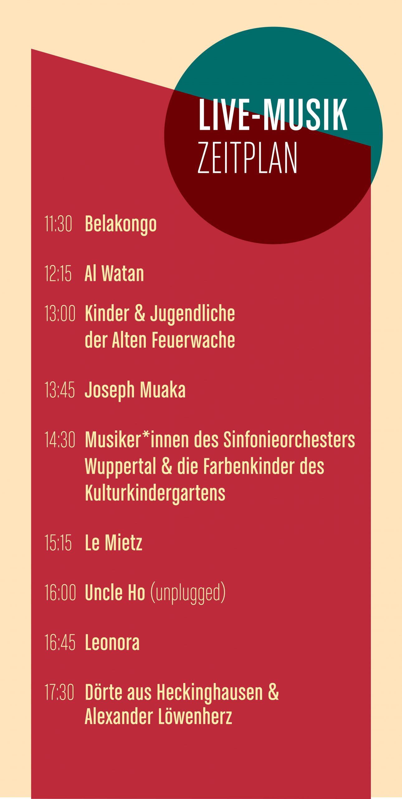 Uncle Ho, Joseph Muaka, Belakongo, Al Watan, Kinder & Jugendliche der Alten Feuerwache, Leonora, Le Mietz, das Sinfonieorchester Wuppertal mit den Kindern des Kulturkindergartens und Dörte aus Heckinghausen & Alexander Löwenherz.