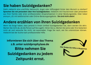 „Deshalb ist ein einfacher Zugang zu Hilfsangeboten entscheidend“, ergänzt L. Kasenko vom Sozialpsychiatrischen Dienst der Stadt Wuppertal. „Prävention beginnt mit einem offenen Ohr.“