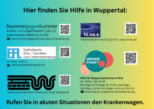 Katholische Ehe-, Familien- und Lebensberatung, Alte Freiheit 1, 42103 Wuppertal, Tel. 0202 – 456111, https://koeln.efl-beratung.de/beratungsstellen/wuppertal/