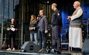 Interview-Part beim WUPPERTAL HILFT!-Benefizkonzert 2021: (v.l.) Moderator Michael Brockordt, Stefan Mageney, Bürgermeister Heiner Fragemann als Vertreter von OB Dr. Uwe Schneidewind und die engagierten Flut-Helfer Tim Oelbermann vom THW und Bruder Dirk vom Kreuzherren-Orden in Beyenburg – © Taro Kataoka„Heute können wir voller Stolz unseren sensationellen Spendenerlös für die Wuppertaler Fluthilfe 2021 bekannt geben: Es sind 50.000 €! Wir sind sehr berührt von der großen Spendenbereitschaft und dem ausverkauften Benefiz-Konzert am 21.08.2021 auf der Sparkassenbühne im Stadthallengarten“, erklärt Stefan Mageney, 1. Vorsitzender von WUPPERTAL HILFT! e.V.