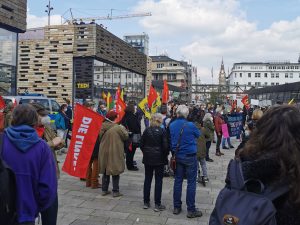 Die Situation in der Pflege war Thema, prekäre Beschäftigung und die hohe Infektionsgefahr in diesen Sektoren. Die Freigabe der Impfpatente wurde gefordert, konsequenter Infektionsschutz in Betrieben und die gesellschaftliche Kontrolle über das Gesundheitswesen. Aber auch viele migrantische Gruppen ergriffen das Wort, Studenten und Jugendverbände, Initiativen für fairen Handel, Frieden, Länderpartnerschaft.