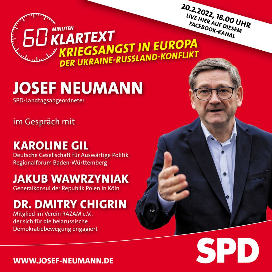 Am kommenden Sonntag, 20. Februar 2022, um 18 Uhr, setzt der Wuppertal-Solinger SPD-Landtagsabgeordnete Josef Neumann sein virtuelles Gesprächsformat „60 Minuten Klartext – Josef Neumann im Gespräch“ zum Thema: „Kriegsangst in Europa – Der Ukraine-Russland-Konflikt“ fort.
