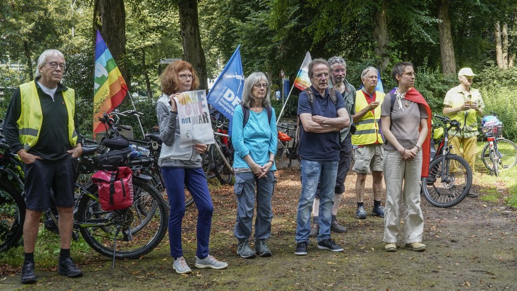 Auf dem Weg von Remscheid nach Wuppertal machte die Tour einen Stop im Stadtgarten von Wuppertal Ronsdorf, einem Geschichtspark zu Krieg und Frieden. Im Stadtgarten wurden die Friedensfahrer:innen von Mitgliedern des Wuppertaler Friedensforums und Bürger:innen von Ronsdorf empfangen: