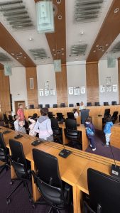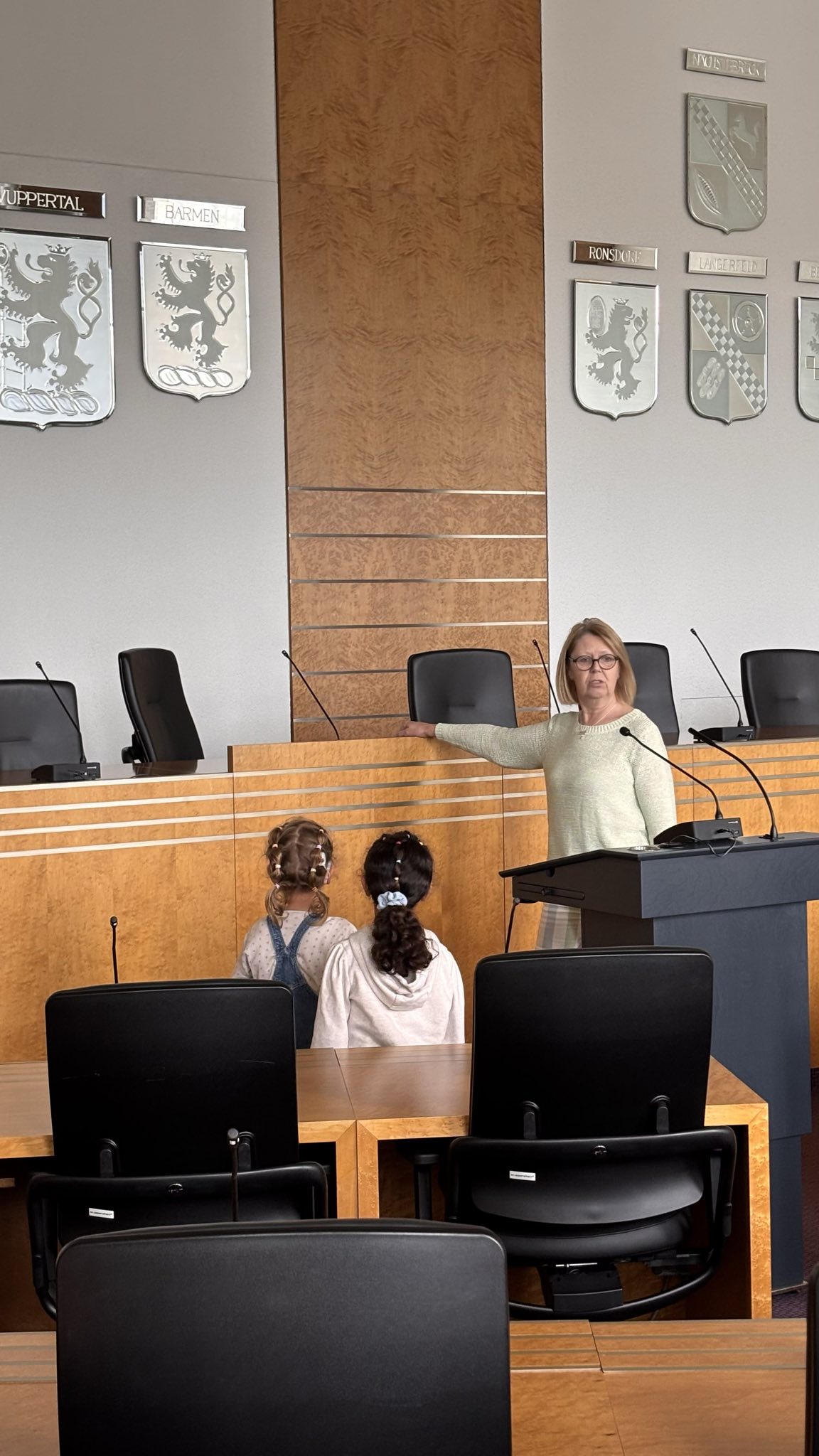 In Zusammenarbeit mit der KiTa-Leitung Irmgard Dobbert wurde zügig ein Termin vereinbart. Die Kinder erhielten eine exklusive Führung durch den Ratssaal des Barmer Rathauses und durften dabei auch auf dem Stuhl der Oberbürgermeister*in Platz nehmen.