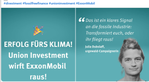„Steter Tropfen höhlt den Stein! Permanenter Druck auf Fondsanbieter, Klimazerstörer rauszuwerfen, zeigt Wirkung: Union Investment hat sich von allen Investments in den Ölgiganten ExxonMobil getrennt! Damit erreichen wir einen Meilenstein! Das ist ein klares Signal an die fossile Industrie: Transformiert euch oder ihr fliegt raus! “