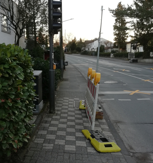 Außerdem fehlen hier die Absenkungen oder Rampen. 10 cm könnten für Behinderte ein Hindernis sein. Das gleiche auf der andern Straßenseite.
