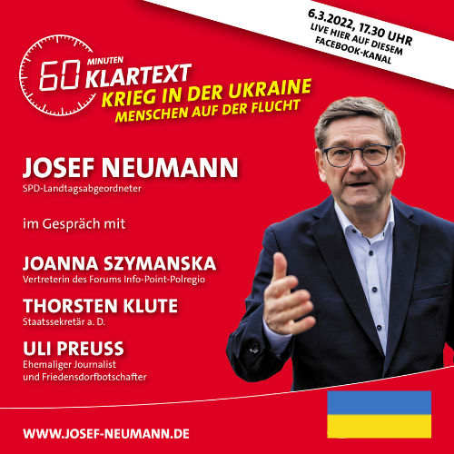 Am kommenden Sonntag, 06. März 2022, um 17:30 Uhr führt der Solinger/Wuppertaler Landtagsabgeordnete Josef Neumann sein virtuelles Gesprächsformat „60 Minuten Klartext – Josef Neumann im Gespräch“ fort.