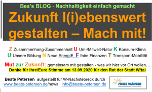 Mein Name ist Beate Petersen. Viele kennen mich aus dem Engagement gegen die Ansiedlung von IKEA in W-Nord. Dies war tatsächlich mein persönlicher Impuls, um aktiv laut zu werden. Diesen habe ich längst in breites Engagement für unseren Stadtrand Raum W-Nord, in vielfältigen Wuppertaler Netzwerken und darüber hinaus umgelenkt habe: