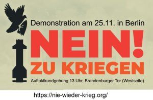 Als friedensbewegter Kreisverband unterstützt DIE LINKE. Wuppertal die Initiative „Nein zum Krieg – Die Waffen nieder!“ und folgt dem Aufruf von über 120 Aktiven aus der Friedensbewegung, Gewerkschaften, Wissenschaft und Zivilgesellschaft zu einer bundesweiten Demonstration am 25. November 2023 in Berlin [https://nie-wieder-krieg.org], um gegen die im Bundestag vorgesehene Verabschiedung des Rüstungshaushalts zu protestieren!