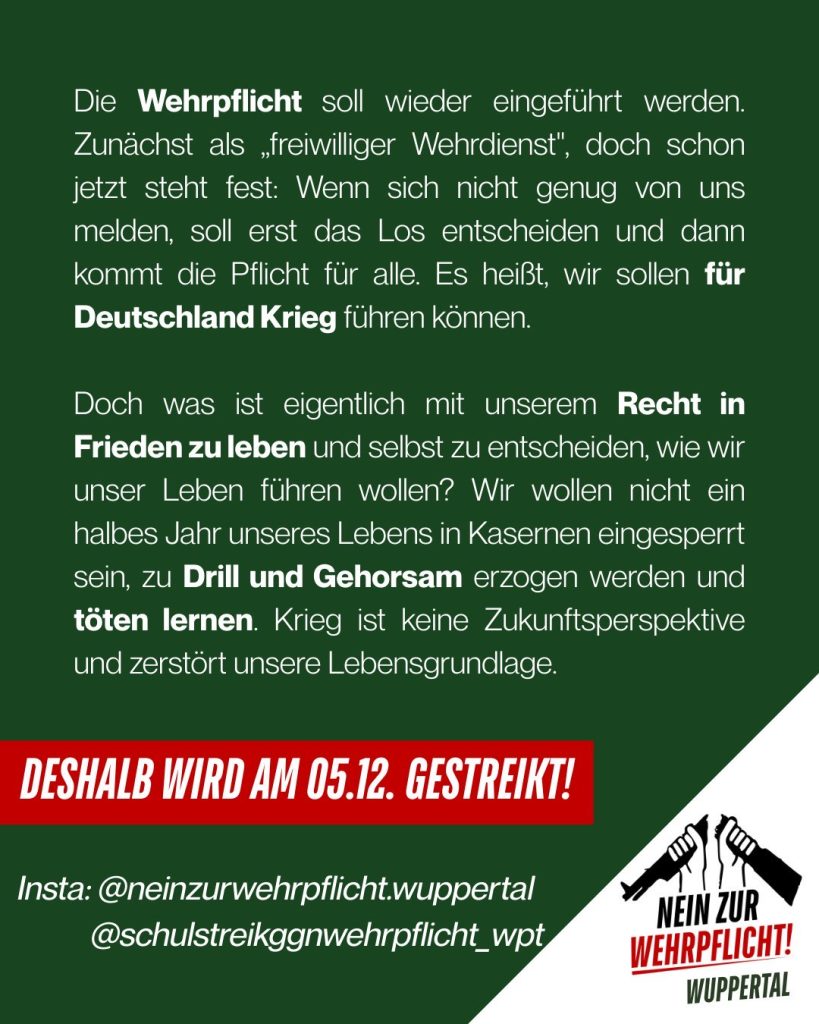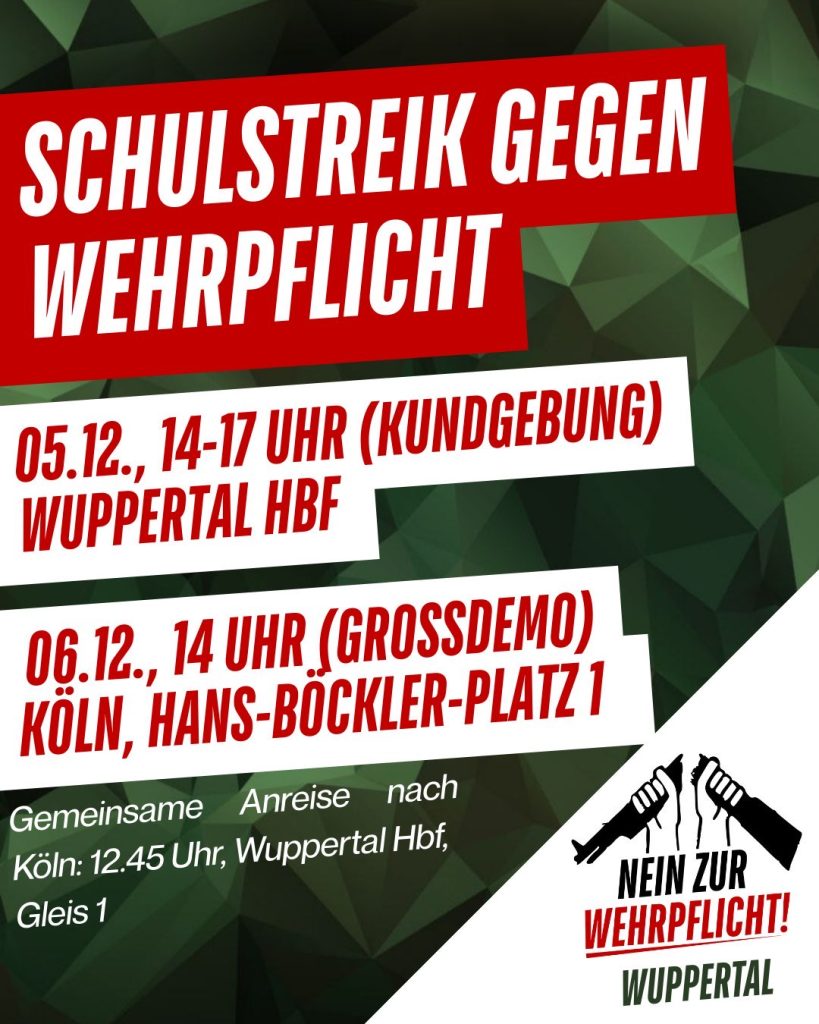 27.11.2025Wuppertaler Friedensforum Frieden Kundgebung Schulstreik Nein zur Wehrpflicht Die Initiative "Nein-zur-Wehrpflicht" in Wuppertal wird am 05.12. um 14 Uhr eine Kundgebung vor dem Hauptbahnhof machen. Am 06.12. geht es gemeinsam zur großen Demo nach Köln. Aktuelle Stellenangebote: »Alle Stellen bei KNIPEX Mehr Info unter https://wupff.wordpress.com/kein-kriegsdienst/ Ähnliche Beiträge:08. Mai – 80. Jahrestag des Kriegsendes und der Befreiung vom FaschismusKundgebung zum Ostermarsch am 19. April 2025Bundeswehr auf der Ausbildungsbörse am 18. SeptemberStellungnahme des Wuppertaler Friedensforums:Antwort des Wuppertaler FriedensforumsVeranstaltungen des Wuppertaler Friedensforums Weiter mit: SPD-Fraktion begrüßt Rückkehr zum regulären WSW-Fahrplan Mit Vorfahrt für Radfahrer in der „Fahrradstraße“ ins Grab Aktuell auf der Rubrik Politik