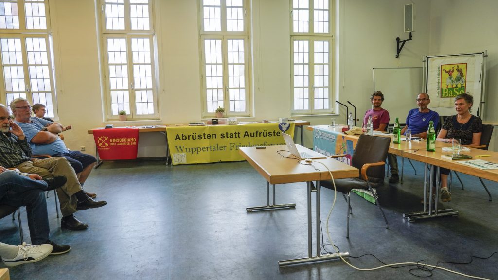 Auch aus dem Publikum gab es bereichernde Beiträge zur den Auswirkungen der Aufrüstung auf das Soziale und Beispiele für den Zusammenhang von Rüstung und Klima. Natürlich reichte die Zeit einer Abendveranstaltung nicht aus, um alle Beiträge in Tiefe zu diskutieren. Sie sollte auch nur der mögliche Beginn einer weiteren Zusammenarbeit ausloten. Das Angebot eines Aktionstrainings war ein ganz konkreter Vorschlag, der von Tobi Rosswog gemacht wurde. Die Veranstaltung beeindruckte und machte Mut, Weiteres muss noch besprochen werden.