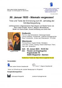 Am 30. Januar 2023 möchten wir unsere Gedenkaktivitäten mit einer großen Gedenkveranstaltung im Theater am Engelsgarten starten, die unser Verein zusammen mit der Else Lasker-Schüler-Gesellschaft und der Armin T. Wegner-Gesellschaft organisiert. https://www.wuppertal-live.de/?437529.