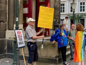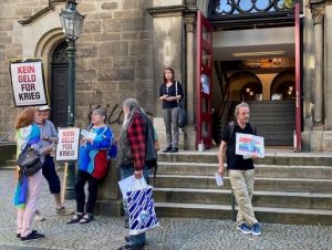 Einige Aktive vom Wuppertaler Friedensforum hatten sich spontan entschlossen, vor der Kirche andere Werte als Feindbilder, Waffenlieferungen und mehr Geld für das Militär zu vertreten: „Du sollst nicht Töten“ steht in der Bibel – und dann solch eine Politikerin in einer Kirche!