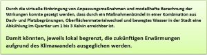 Das erstaunliche Ergebnis zeigte sich in der Simulation in um 3 bis 7 Grad gesenkten Oberflächentemperaturen, die sich in um bis zu drei Grad Temperatursenkungen im Modellraum auswirken. Besonders effektiv zeigte sich der Austausch des Oberflächenmaterials am Neumarkt durch Austausch des dunklen Asphalts gegen ein helles Pflaster.