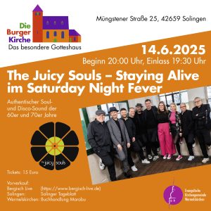 Am Samstag, den 14. Juni 2025, gastieren The Juicy Souls bereits zum dritten Mal in der Burger Kirche. Mit ihrer handgemachten Soul- und Disco-Musik wird die Band die Burger Kirche in einen glitzernden Dance-Club verwandeln.