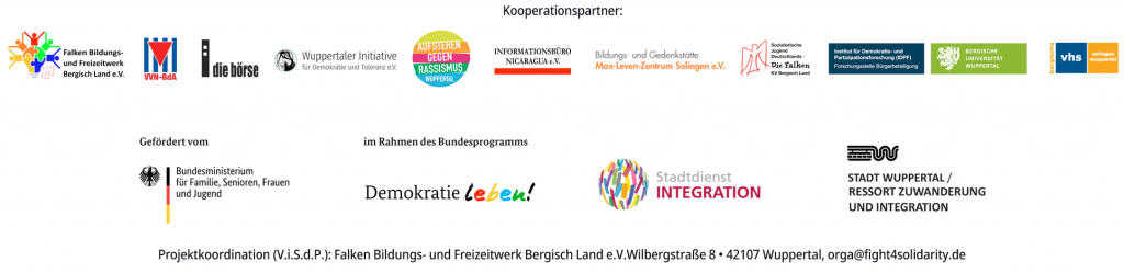 Alle Veranstaltungen finden im Rahmen der Bildungsreihe „Fight for Solidarity – Zerrissenheit und Zusammenhalt in Zeiten gesellschaftlicher Krisen“ des Falken Bildungswerks Bergisch Land und seiner regionalen Kooperationspartner*innen statt und wird finanziert u.a. aus Mitteln der Städte Solingen und Wuppertal sowie des Bundesministeriums für Familie, Senioren, Frauen und Jugend im Rahmen des Bundesprogramms „Demokratie Leben!“
