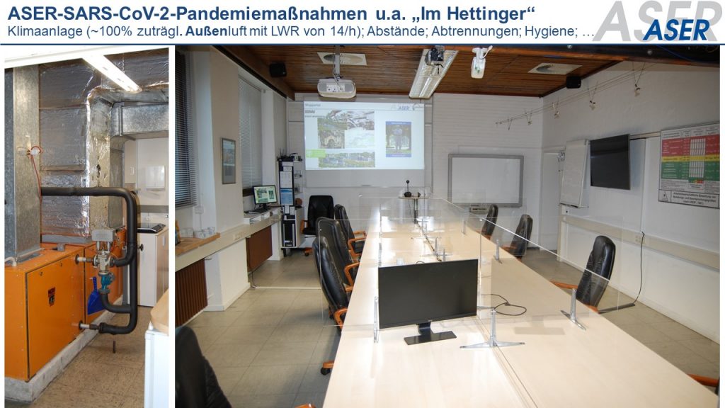 Im Sommer 2019 konnte die ASER-Klimaanlage ertüchtigt werden, so dass u.a. „Im Hettinger“ eine ~100% zuträgliche Außenluft mit einer Luftwechselrate von 14/h erreicht wird sowie im Frühjahr 2020 zusätzlich die pandemiebedingten AHA-Regeln arbeitsgestalterisch dort umgesetzt wurden. ©ASER, WuppertalBasis hierzu sind die sechs belastungsartspezifischen Leitmerkmalmethoden, die im Webinar vorgestellt, mit Praxisbeispielen erläutert und mit über 1.000 Live-Chat-Beiträgen von den Teilnehmer*innen mit den Referenten diskutiert wurden.