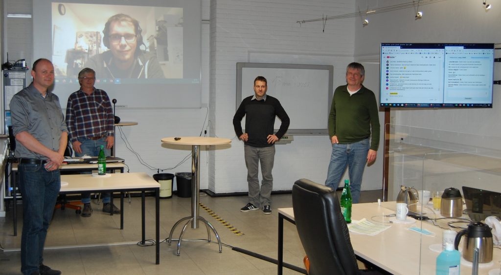 Die Referenten und der technische Systemadministrator vom BAuA-LMM-Webinar [v.l.n.r.: Prof. Dr.-Ing. André Klußmann (HAW Hamburg & Institut ASER e.V., Wuppertal), Dipl.-Ing. Martin Keuchel (GEWITEB mbH, Wuppertal), M.Sc. Patrick Serafin (Institut ASER e.V., Wuppertal, zugeschaltet aus dem Remscheider Homeoffice), M.Sc., Dipl.-Ing. Christoph Mühlemeyer (Institut ASER e.V., Wuppertal) und Dipl.-Ing. Andreas Schäfer (Institut ASER e.V., Wuppertal)] nachmittags am 9. Dezember 2020 für das Abschlussfoto auch kurz maskenfrei. ©ASER, WuppertalWeiter mit: