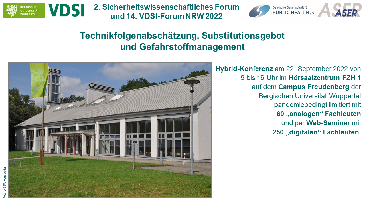 Hierfür luden die Bergische Universität Wuppertal und die fünf nordrhein-westfälischen VDSI-Regionalgruppen Bergisches Land, Düsseldorf, Köln, Ruhr-Niederrhein und Westfalen gemeinsam mit der Deutschen Gesellschaft für Public Health e.V. (DGPH) und dem Institut für Arbeitsmedizin, Sicherheitstechnik und Ergonomie e.V. (ASER) ein, das seit Herbst 2015 zum achten Mal in Folge in der Bergischen Universität Wuppertal veranstaltet worden ist.