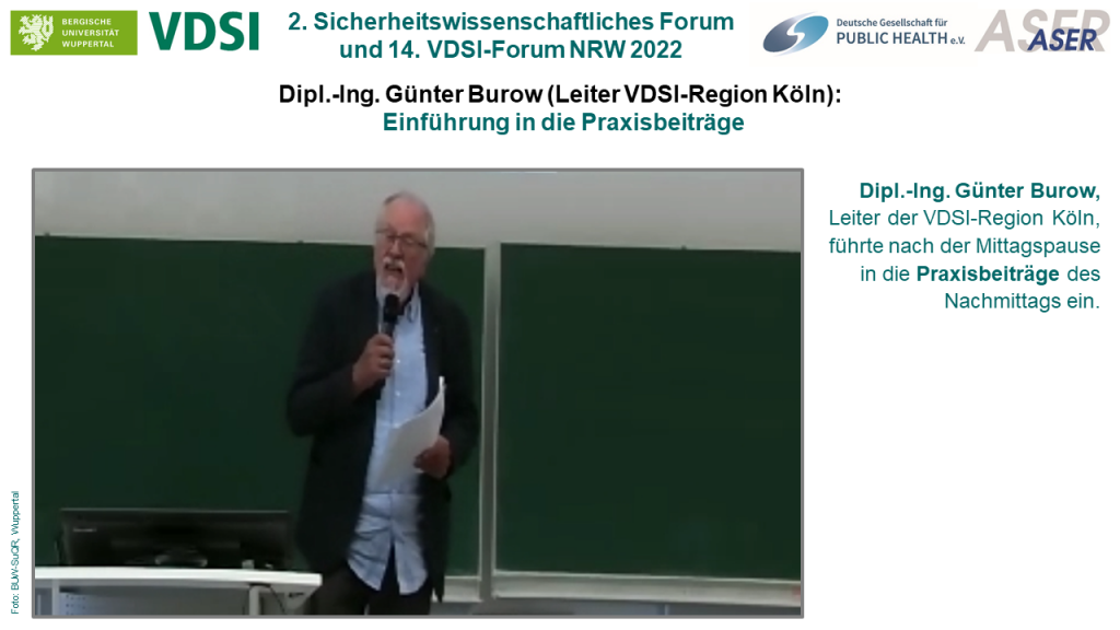 Dipl.-Ing. Günter Burow, Leiter der VDSI-Region Köln, führte nach der Mittagspause in die Praxisbeiträge des Nachmittags ein. ©BUW-SuQR, WuppertalZudem können Sie übersichtlich hier die Ergebnisdokumentationen zu den veranstalteten Foren seit dem Jahr 2015 einsehen, welche von oder zusammen mit der Bergischen Universität Wuppertal (Ansprechpartner: Prof. Dr. Ralf Pieper, Fachgebiet Sicherheits- und Qualitätsrecht) durchgeführt wurden. Eine zusammenfassende Ergebnisdokumentation zum hybrid veranstalteten Forum vom 22. Septermber 2022 inklusive der erst noch freizugebenden Präsentationsbeiträge, die die Referent*innen dankenswerterweise zur Verfügung stellen, wird voraussichtlich Ende September 2022 an dieser Stelle publiziert werden.
