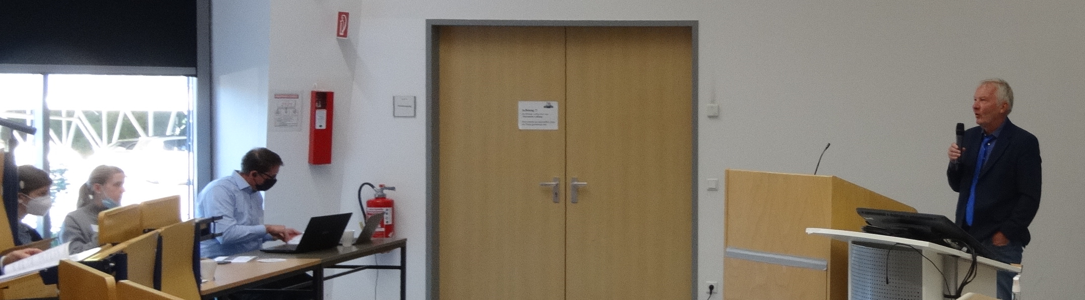 Hörsaalzentrum FZH auf dem Campus Freudenberg der Bergischen Universität Wuppertal als analoger Veranstaltungsort des diesjährigen Forums sowie ebenso die technische Organisationszelle des digitalen bzw. virtuellen Web-Seminars. ©ASER, WuppertalAuch das diesjährige Forum im Hörsaalzentrum des Campus Freudenberg der Bergischen Universität Wuppertal wurde vom Fachgebietsleiter Sicherheits- und Qualitätsrecht Prof. Dr. Ralf Pieper eröffnet, an dem vor Ort pandemiebedingt limitiert 60 Fachleute und virtuell um 9:00 Uhr schon über 200 Fachleute online zugegen waren. Über die Tagesveranstaltung hinweg nahmen dann neben den 60 Fachleuten vor Ort zudem 250 Fachleute virtuell an dem Forum teil, wobei über letzteren Transferweg in der Regel viel mehr Teilnehmer*innen live erreicht werden, da solche Veranstaltungen nicht selten in Seminarräume (Beamer, Leinwand, Lautsprecheranlage o.Ä.) von Organisationen (Unternehmen, Institute, Behörden o.Ä.) übertragen werden.