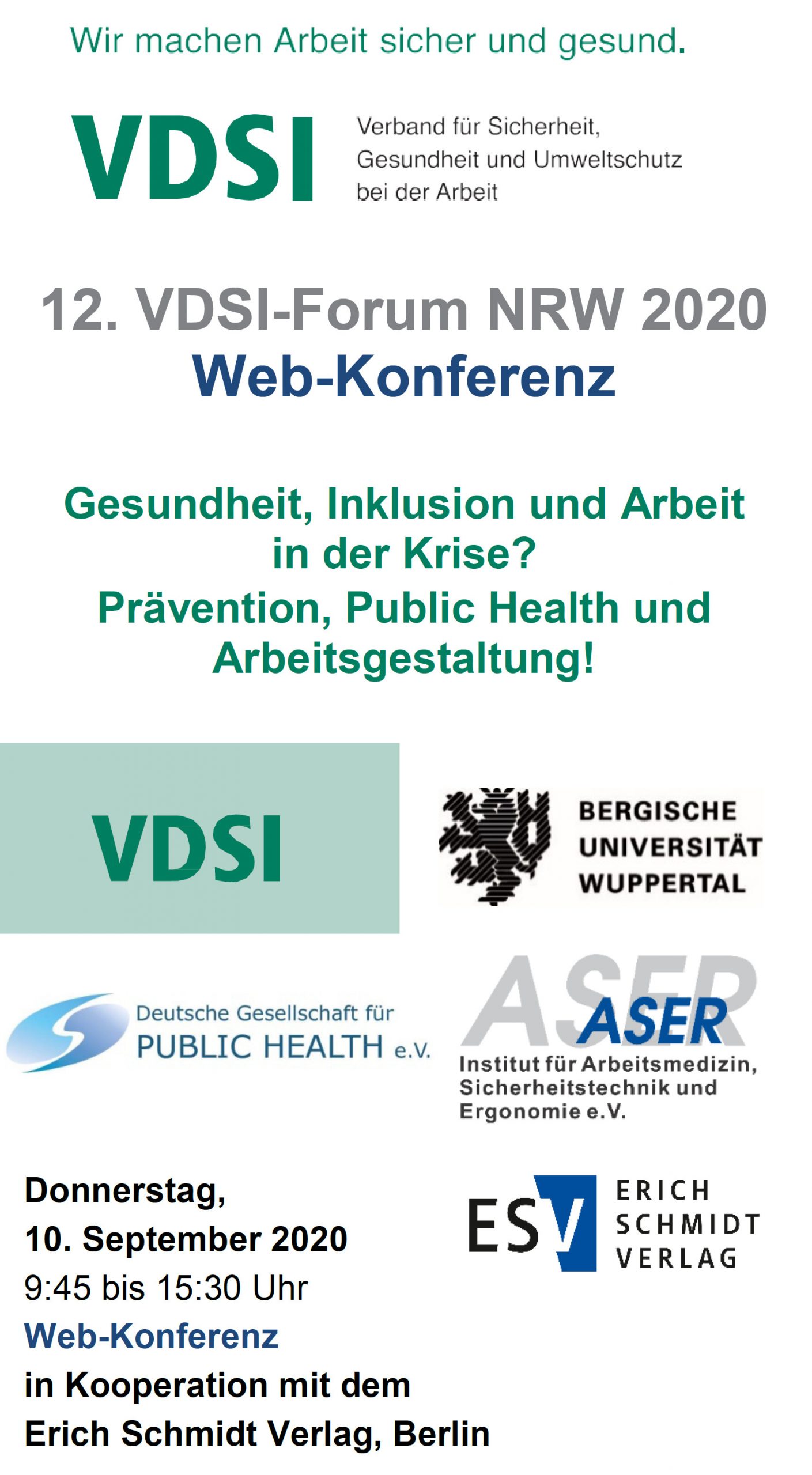 Am 10. September 2020 findet mit dem 12. VDSI-Forum NRW die diesjährige Gemeinschaftsveranstaltung der fünf nordrhein-westfälischen VDSI-Regionen Bergisches Land, Düsseldorf, Köln, Ruhr-Niederrhein und Westfalen statt, die in Kooperation mit dem Fachgebiet Sicherheits- und Qualitätsrecht der Bergischen Universität Wuppertal, dem Erich-Schmidt-Verlag (ESV), der Deutschen Gesellschaft für Public Health e.V. (DGPH) und dem Institut für Arbeitsmedizin, Sicherheitstechnik und Ergonomie e.V. (ASER) veranstaltet wird (Programm).