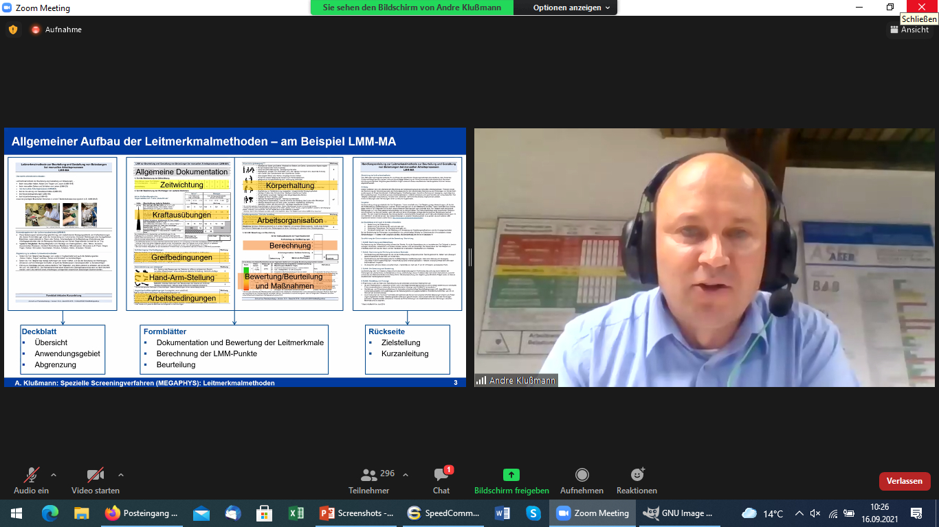 Prof. Dr.-Ing. André Klußmann (ASER, Wuppertal / HAW Hamburg) diskutierte die Entwicklung und Ergebnisse des mehrstufigen Leitmerkmalmethoden-Inventars vom MEGAPHYS-Gemeinschaftsprojekt der BAuA und DGUV. ©ASER, WuppertalPraxisrelevante Methoden und Betriebsbeispiele zur Prävention und menschengerechten Arbeitsgestaltung werden pandemiebedingt in der Web-Konferenz bis heute Nachmittag diskutiert. Die Beiträge werden im nächsten Band zum Sicherheitswissenschaftlichen Kolloquium Anfang 2022 veröffentlicht.